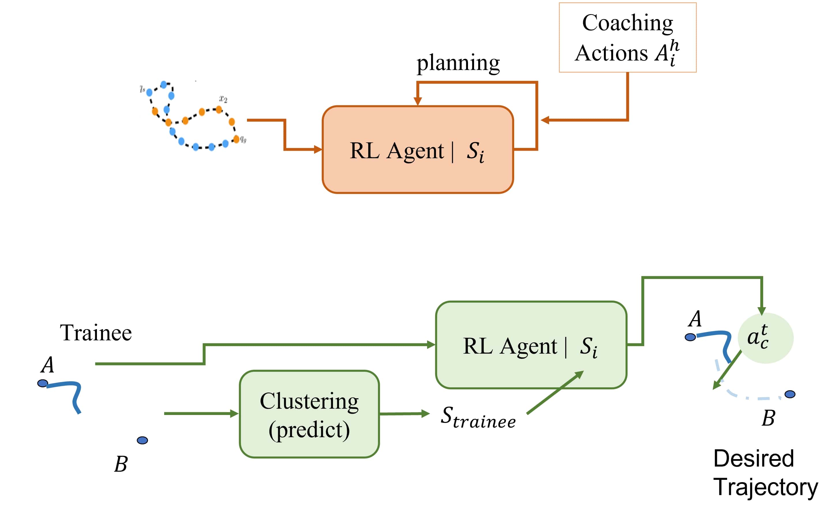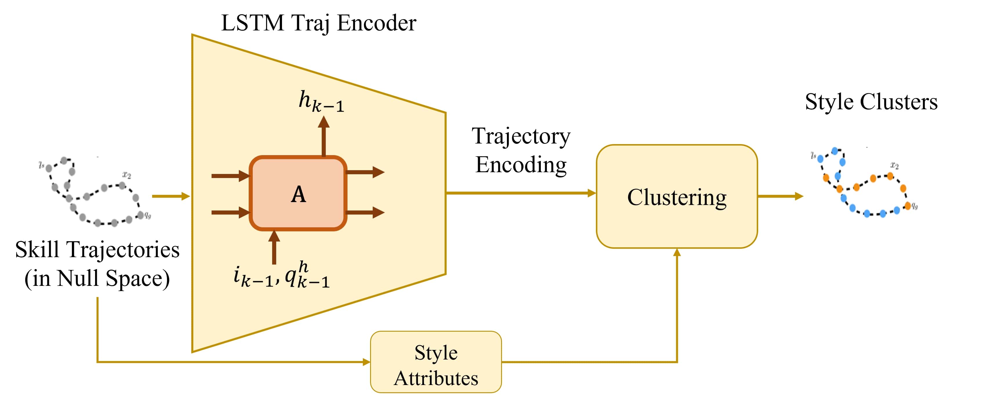 The task null-space trajectories are grouped using an unsupervised clustering method to generate the style clusters and identify their mean and variance. For learning to mentor, the robot learns a policy through off-policy deep reinforcement learner per given style, trained to estimate mentoring corrections based on the current trajectory of trainee and estimate of his performance. The agent is trained on the set of corrective actions human experts provided during the robot training.